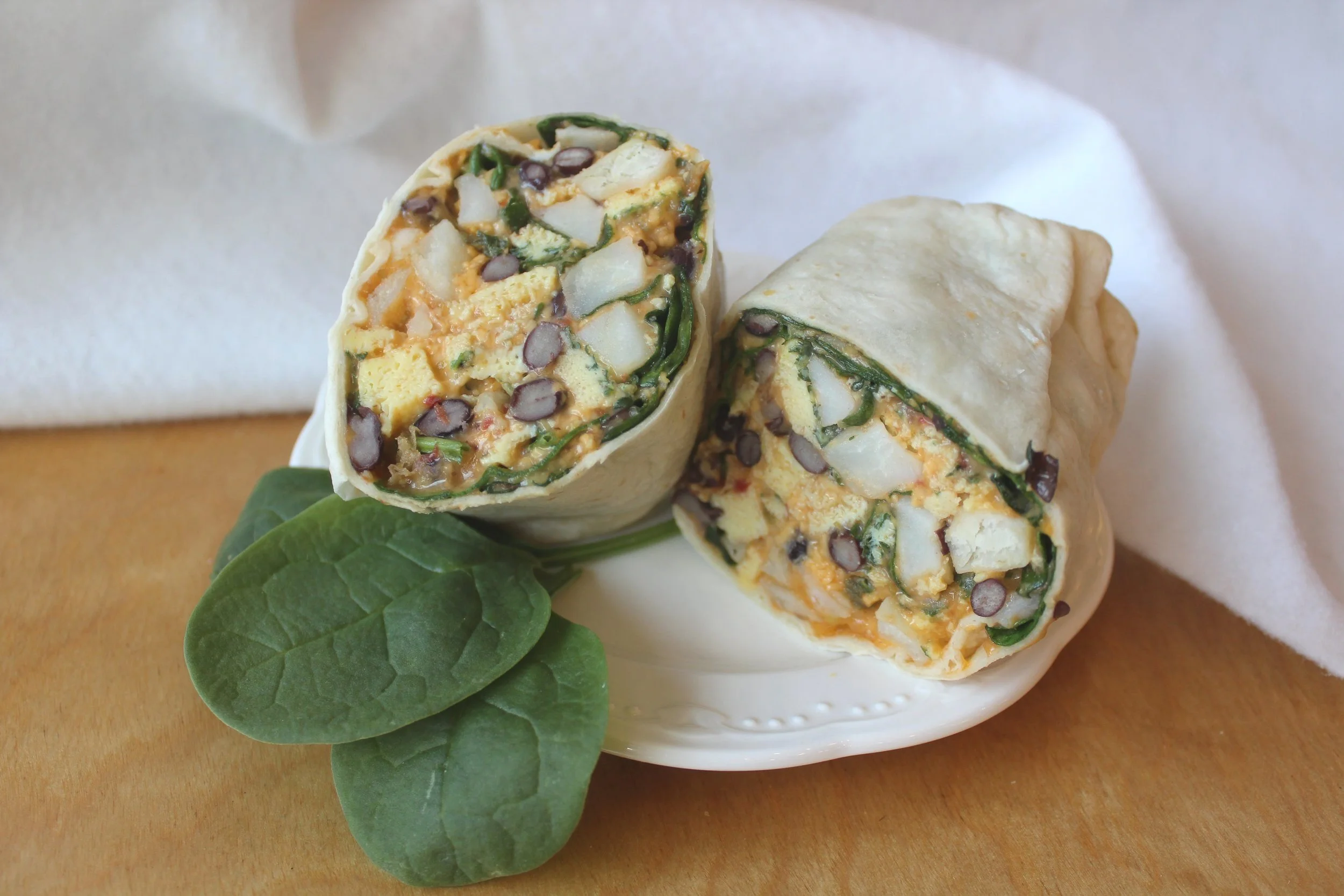 with eggs, green chili, cheddar cheese, potatoes, and black beans in a flour tortilla
